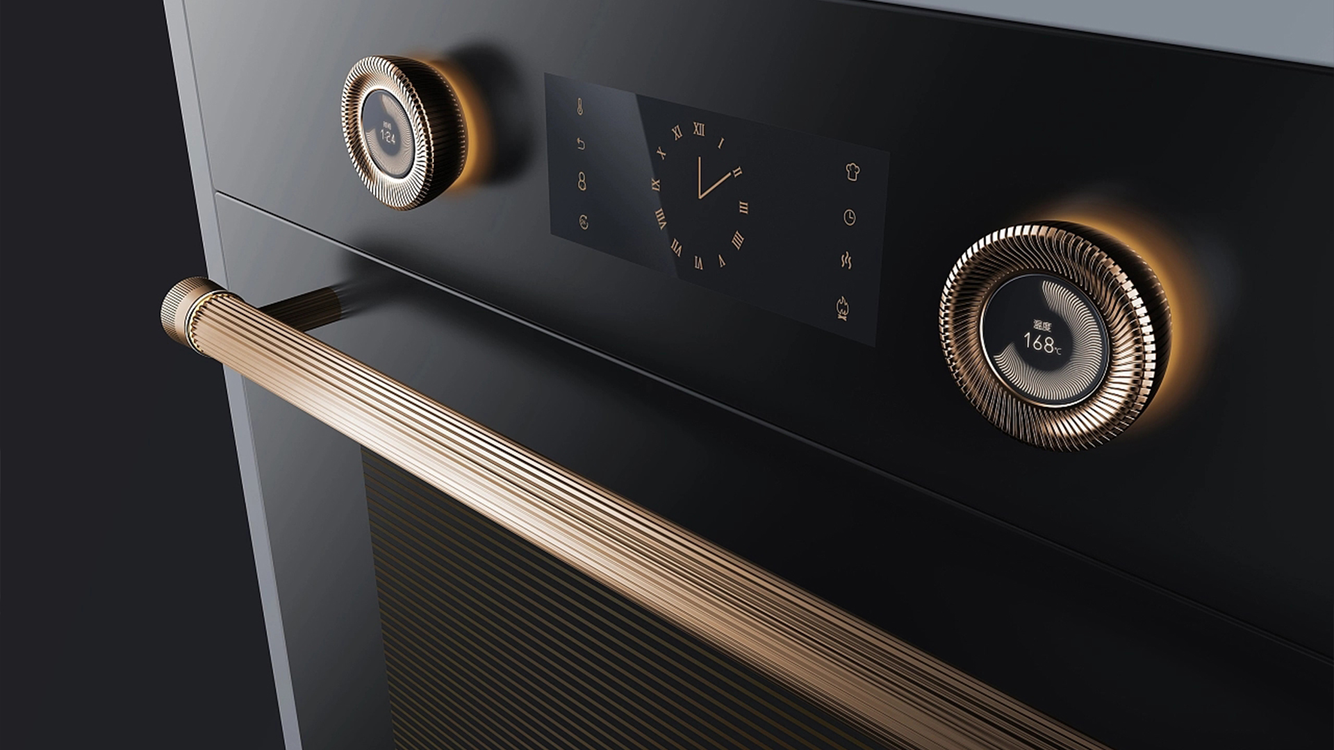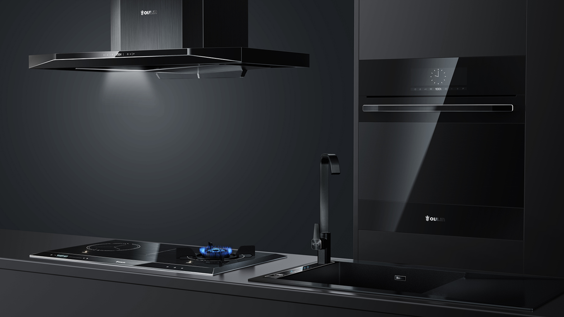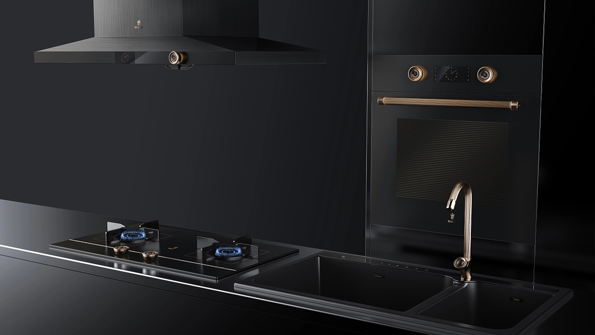外觀上,該系列廚房電器外觀采用黑色鋼化玻璃,配上高亮銀色、玫瑰金的航空鋁材,按照美學比例進行幾何分割,給人高端價值的印象。油煙機內部采用內單層O型過濾網,外平板側吸過濾,內外結合油煙徹底分離,健康環保。精確的45度黃金斜角敞開設計,防止用戶意外磕碰。整體采用近距快吸式設計,徹底排除油煙。同時,我們擴大了金屬油杯的容量,減少倒油次數,從根本上方便使用者清理。在燃氣灶設計上,我們大膽采用顯示屏+觸控調節按鍵設計,任意調控烹飪模式,為用戶帶來更智能的廚房體驗。