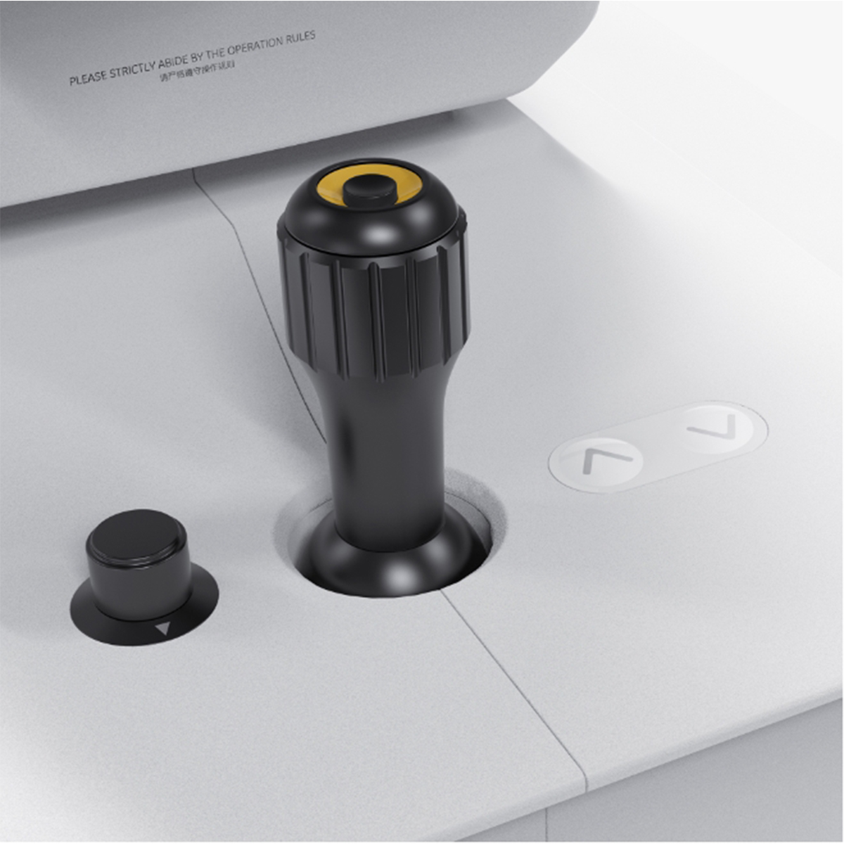 完整的大曲面包裹住主機的所有結構件,深灰與白色的分色,整機充滿未來與科技感,賦予產品引領行業的使命;嵌入式臉托,隱藏式摳手等細節的設計,盡量保證產品 設計元素的統一性,增強一體性。 手柄處黃色標識圈作為品牌識別點將應用到系列產品中,形成視微品牌自己的品牌形象特點。