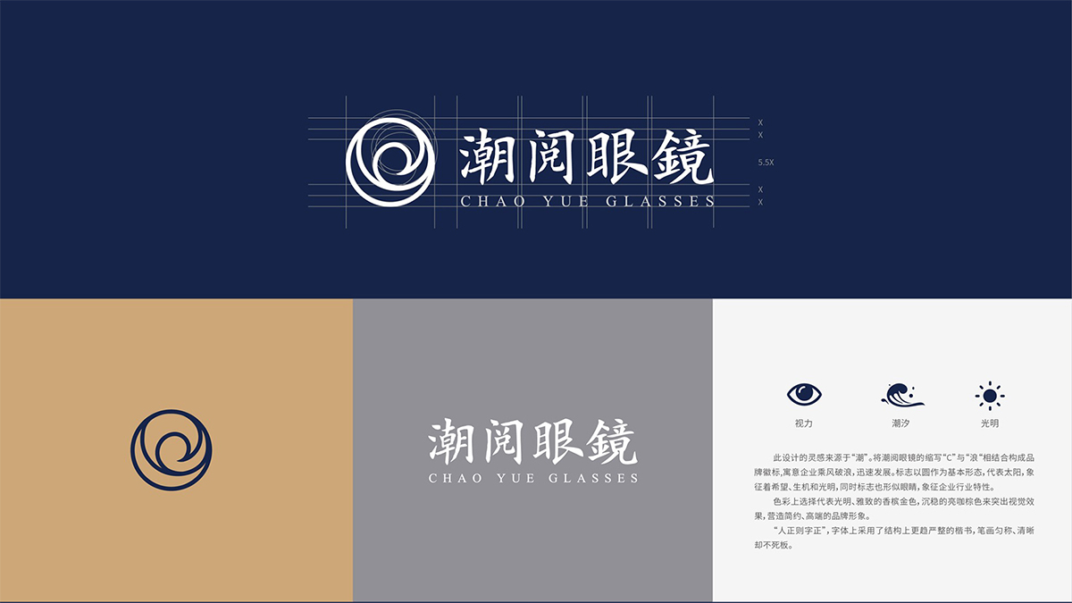此設計的靈感來源于“潮”。將潮閱眼鏡的縮寫“C”與“潮“相結合構成品牌徽標,寓意企業乘風破浪,迅速發展。標志以日出作為基本形態,代表太陽,象征看希望、生機和光明,同時標志也形似眼睛,象征企業行業特性。