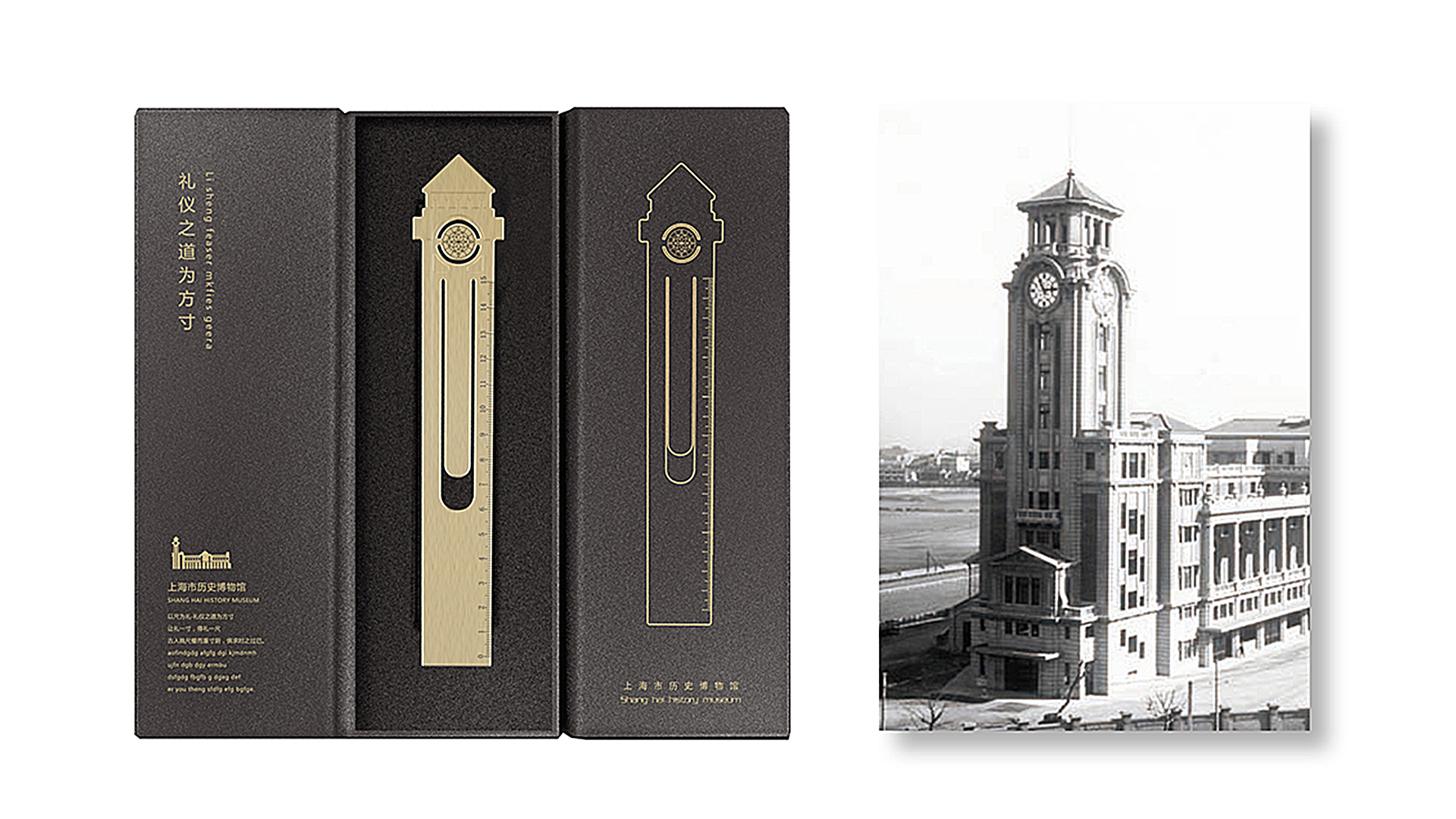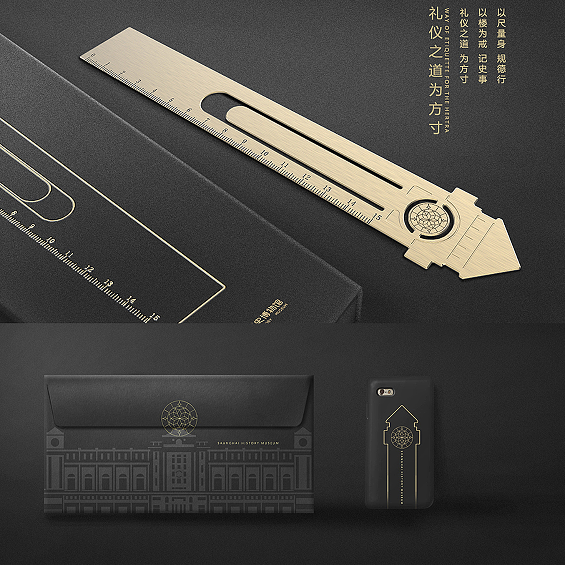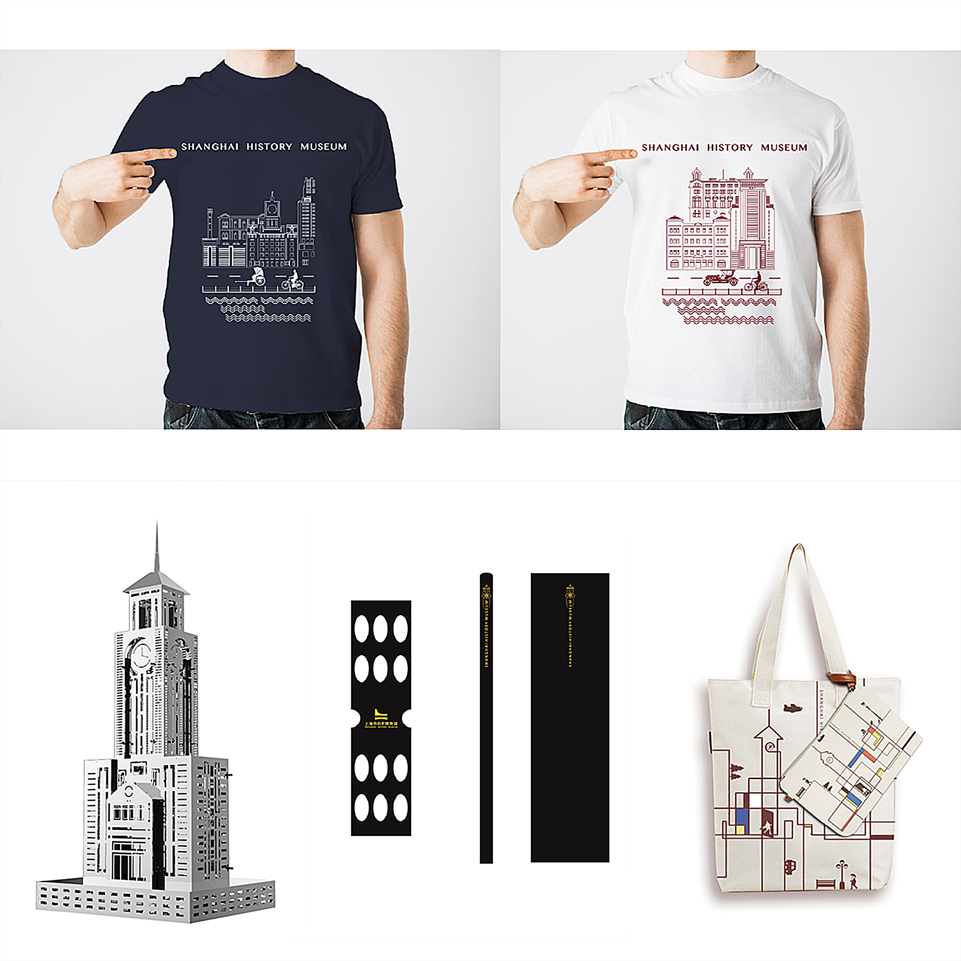 其二:設計師以整棟建筑為設計源,將繁瑣的建筑外形與圖紙簡化,以幾何化、扁平化、符號化手段來突出建筑外觀。輔以活潑配色,用色彩的對比凸顯上海歷史博物館“古今對話,適應當代”的氣質,同時也對外展示上海歷史博物館包羅萬象的大氣胸懷。形成一套寓教于樂,受兒童喜歡的系列產品。輔以黑色與金色,用強烈的色彩對比凸顯上海歷史博物館“滿腹經華,低調謙遜”的氣質,同時也對外展示上海歷史博物館包羅萬象的大氣胸懷。形成一套現代高端的系列產品。