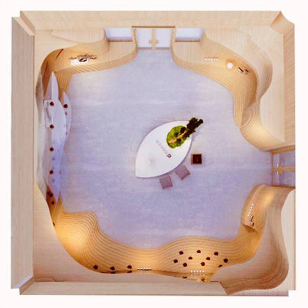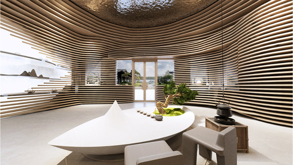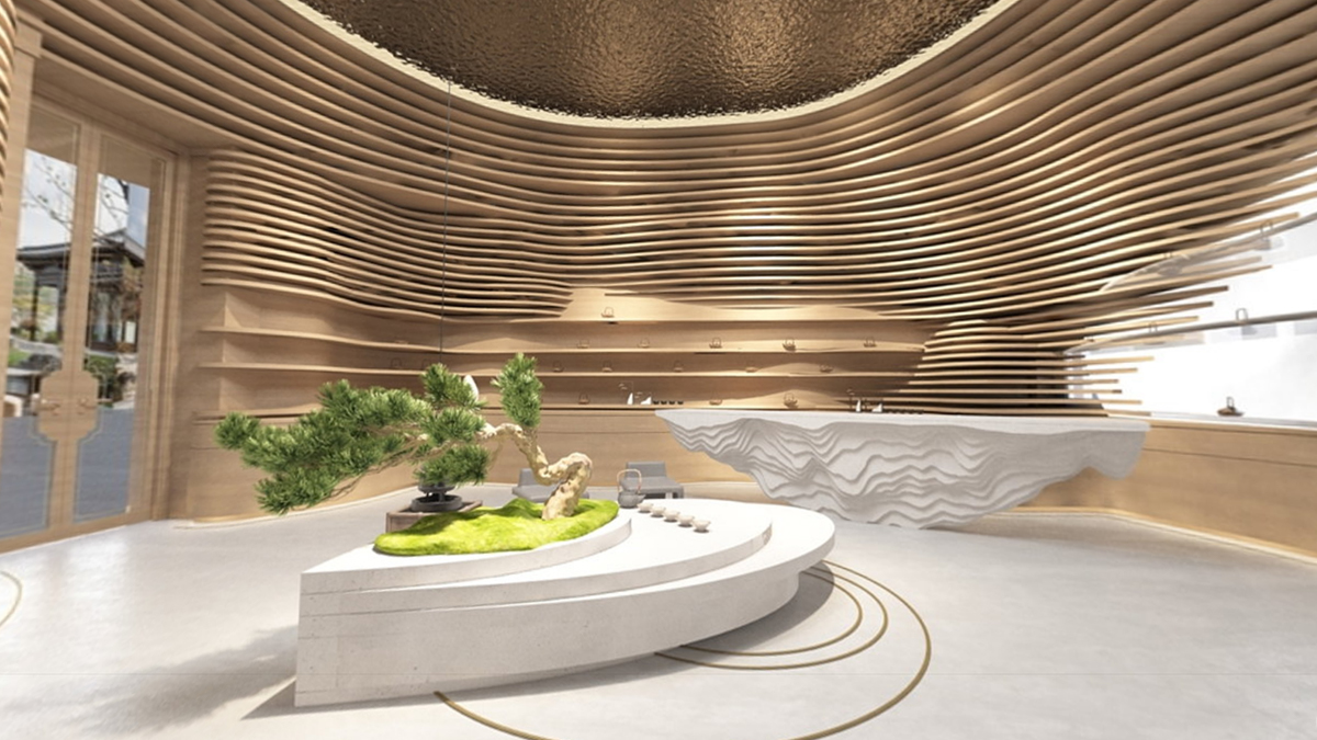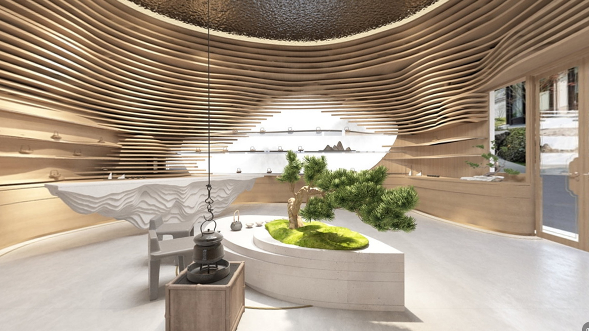 整體空間的靈感來自于自然地形——梯田, 所塑造的自然成型的層次。決定了人與動物行走,相遇,交談,互動的生態(tài)。茶葉本身也是從這個大自然采集而來,整體思路是希望空間能夠跳脫常規(guī)四四方方的死板規(guī)范,因為我們的世界是流動,曲面,不定性的。回歸自然,我們本該將自然界元素融會貫通,改變我們體驗商業(yè)跟人互動的形態(tài),才能從底層反應(yīng)茶這件事請的本質(zhì)。