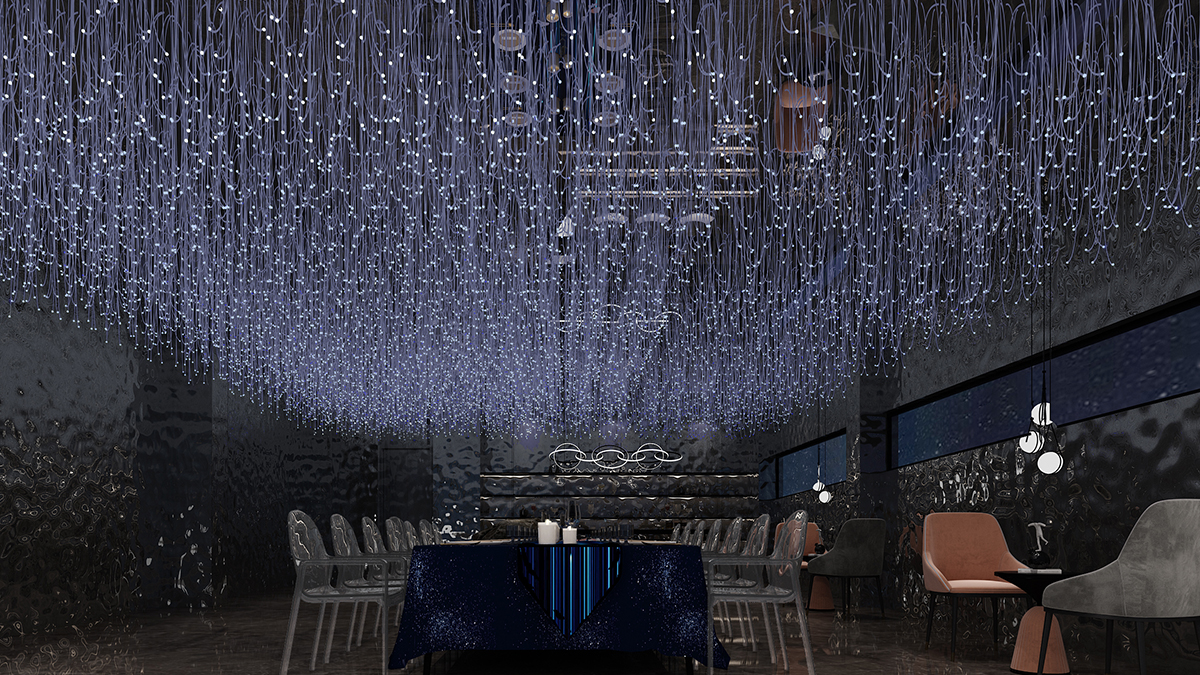 餐廳內垂掛起無數盞LED燈,用來營造一種夢幻星空的環境,星光熠熠,讓你感覺到仿佛置身于“星空”之中。