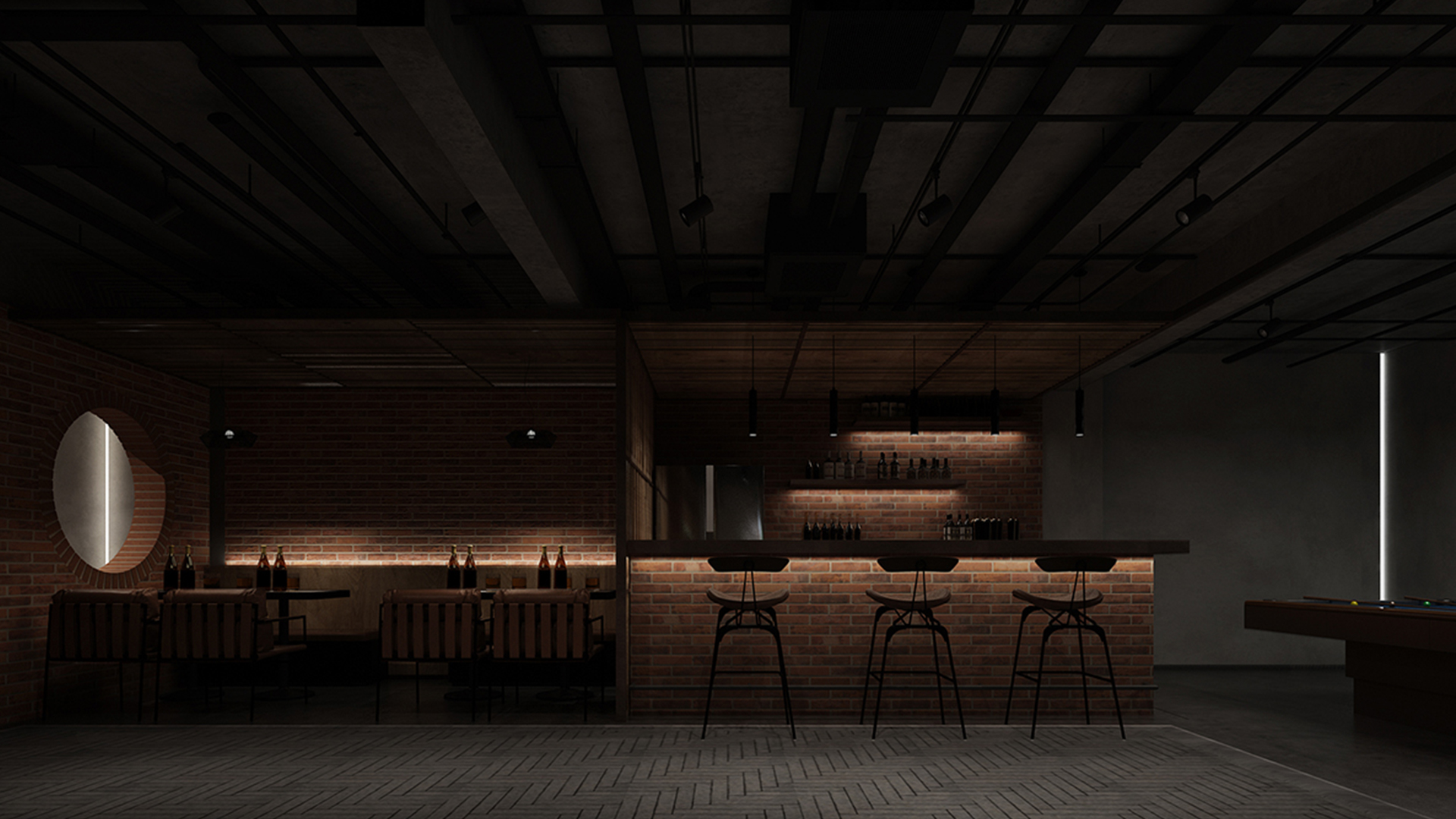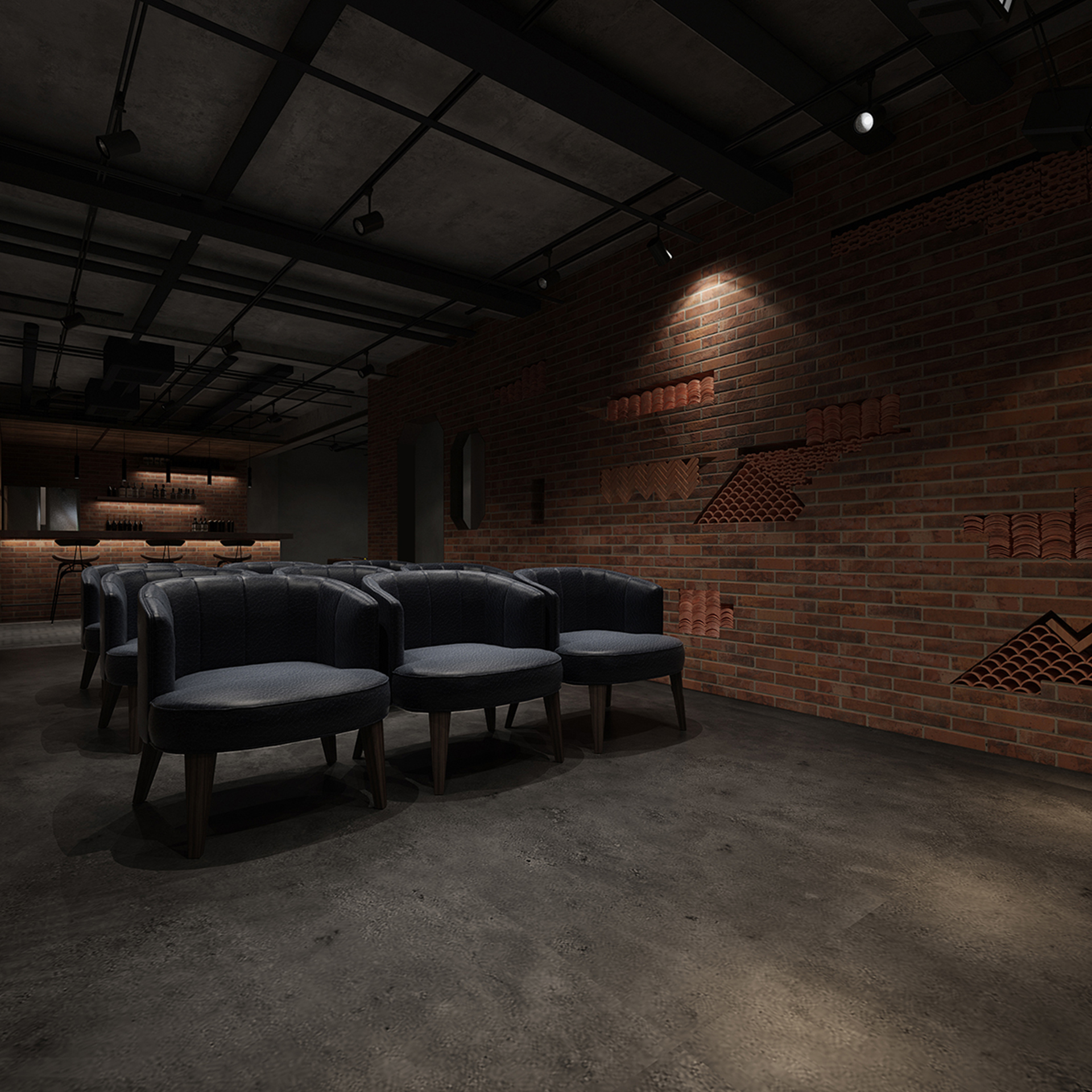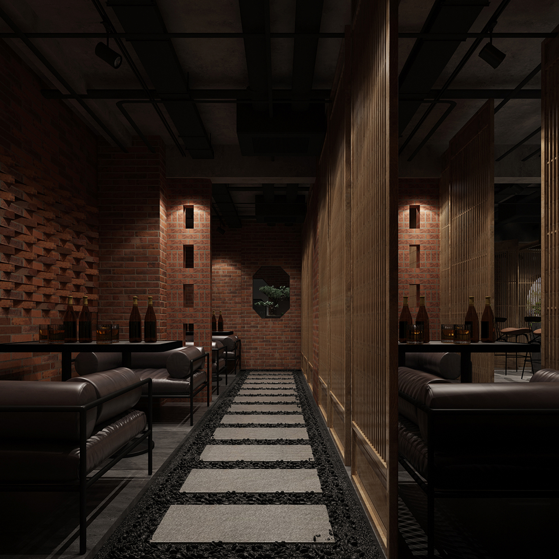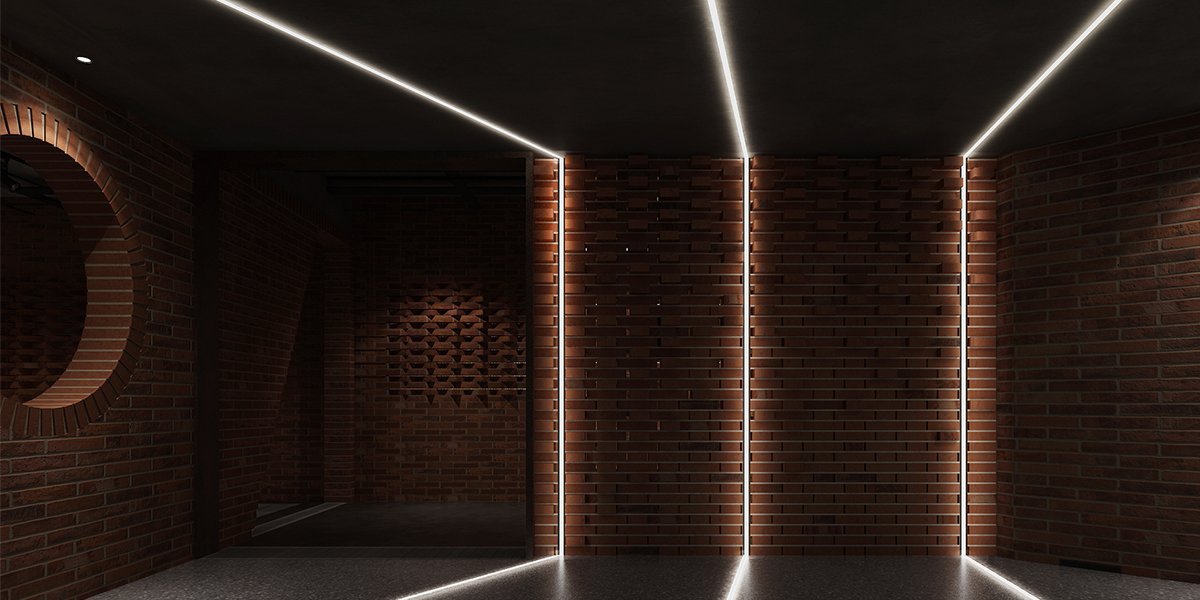 酒吧寬闊的通道讓吧臺、酒墻、沙發區分散開來,讓在不同區域活動的人在碩大的空間中找到自己的歸屬。光在整個空間中扮演著各種角色,有些讓人沉靜,有些讓人興奮。石墻、鵝卵石,最純粹的建筑元素在精心的排布和設計中發揮了其美的特點。墻面構筑元素采用了泡沫紅陶瓷用來模擬紅磚材料,防水防火。昏暗的環境下,人們才真正可以與世隔絕,享受自由。