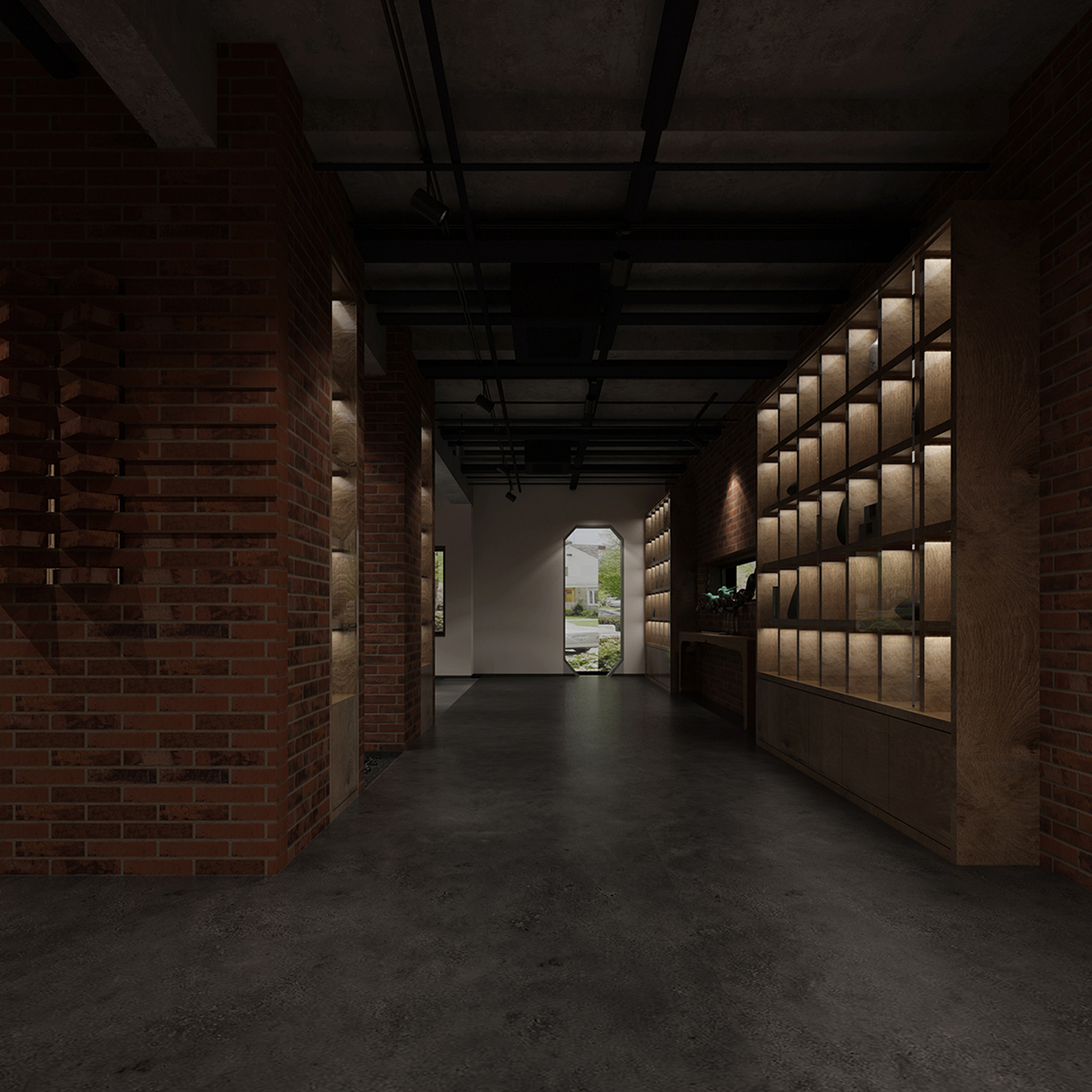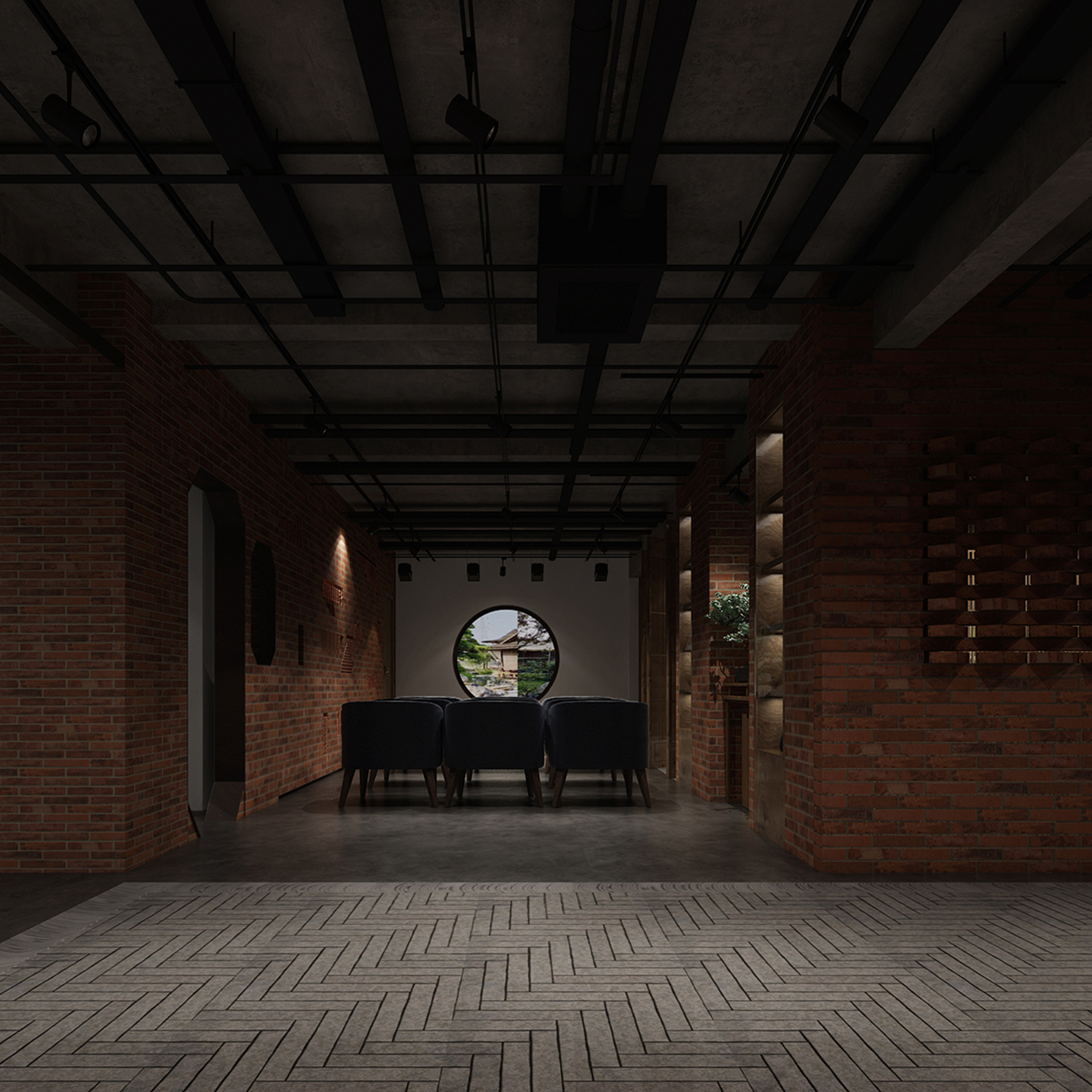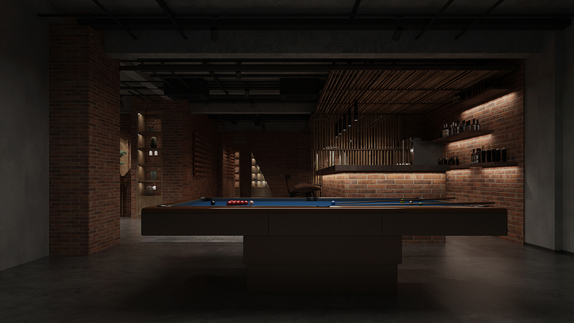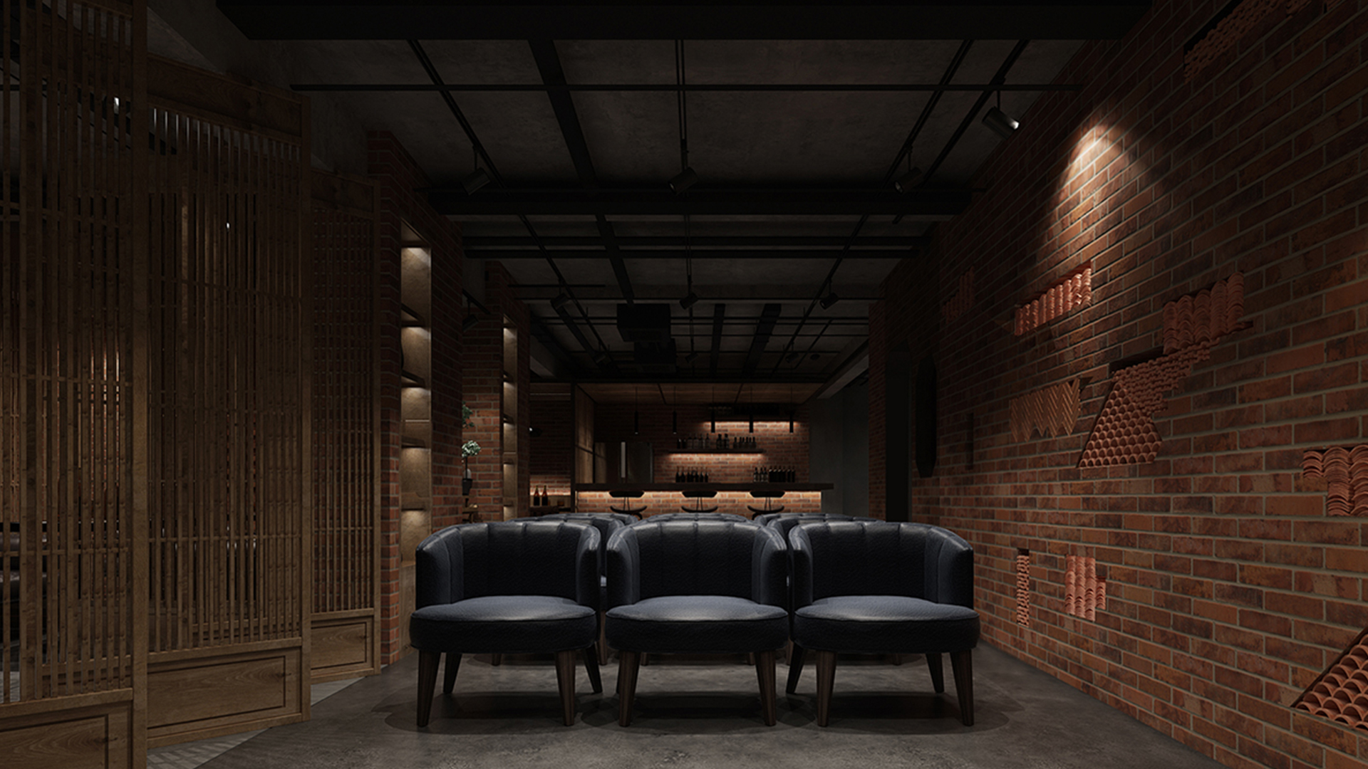 酒吧寬闊的通道讓吧臺、酒墻、沙發區分散開來,讓在不同區域活動的人在碩大的空間中找到自己的歸屬。光在整個空間中扮演著各種角色,有些讓人沉靜,有些讓人興奮。石墻、鵝卵石,最純粹的建筑元素在精心的排布和設計中發揮了其美的特點。墻面構筑元素采用了泡沫紅陶瓷用來模擬紅磚材料,防水防火。昏暗的環境下,人們才真正可以與世隔絕,享受自由。