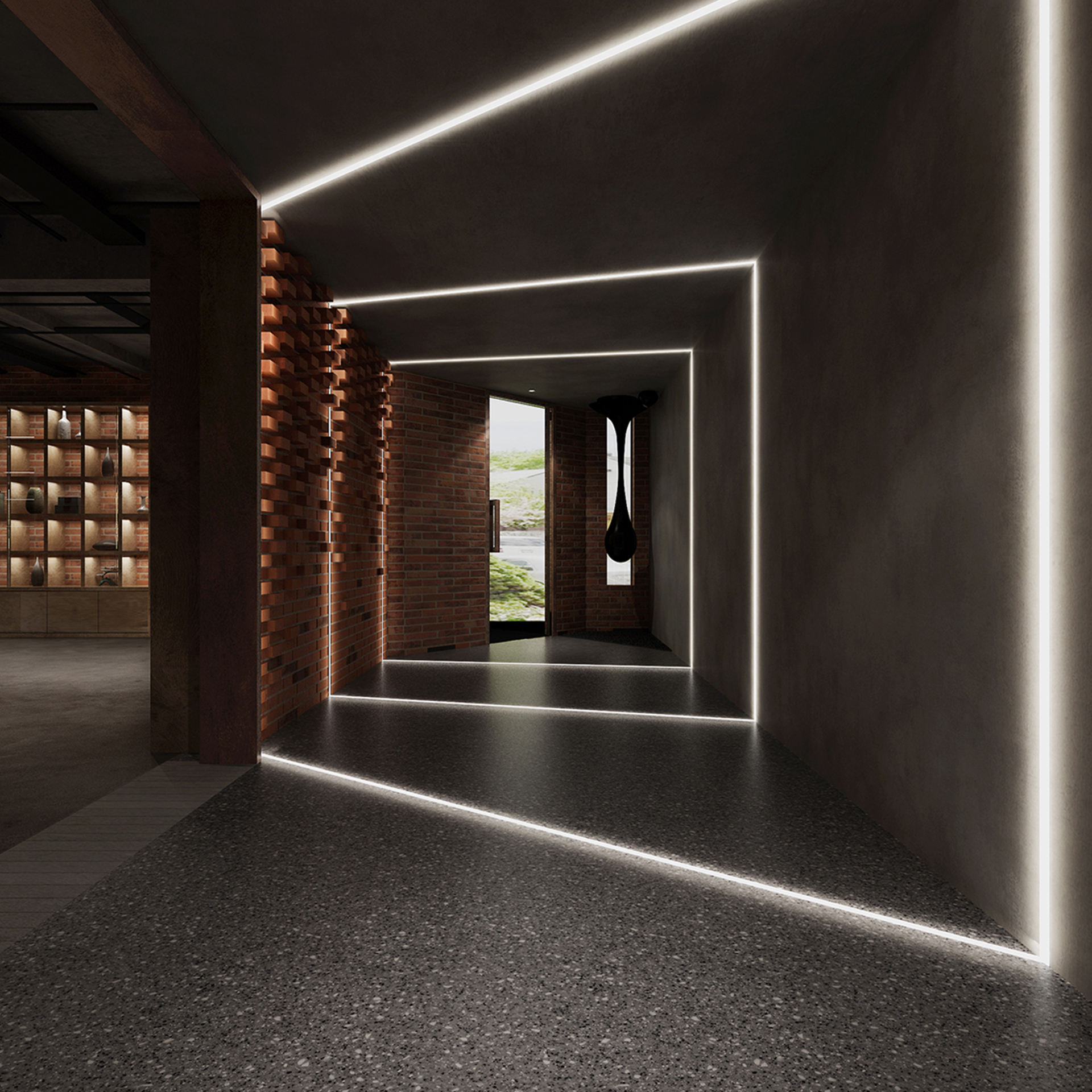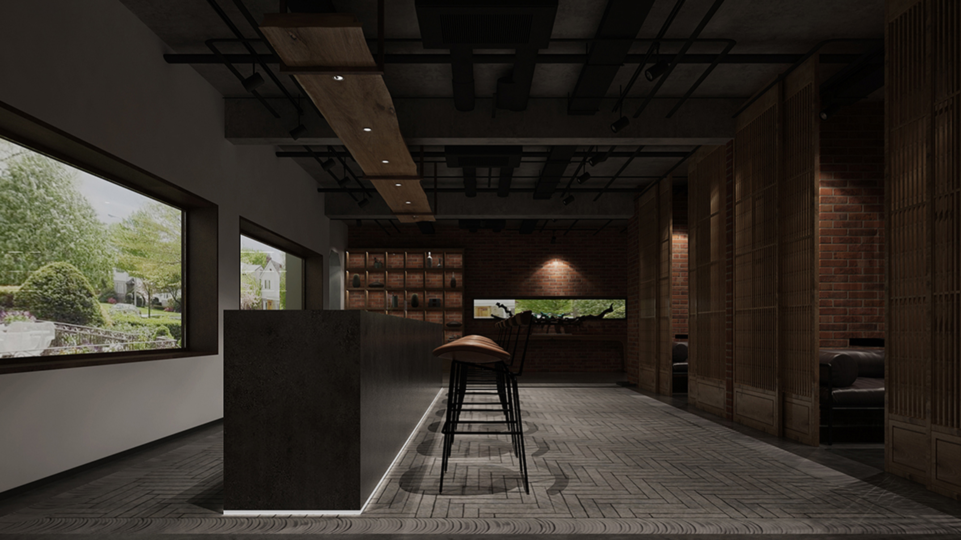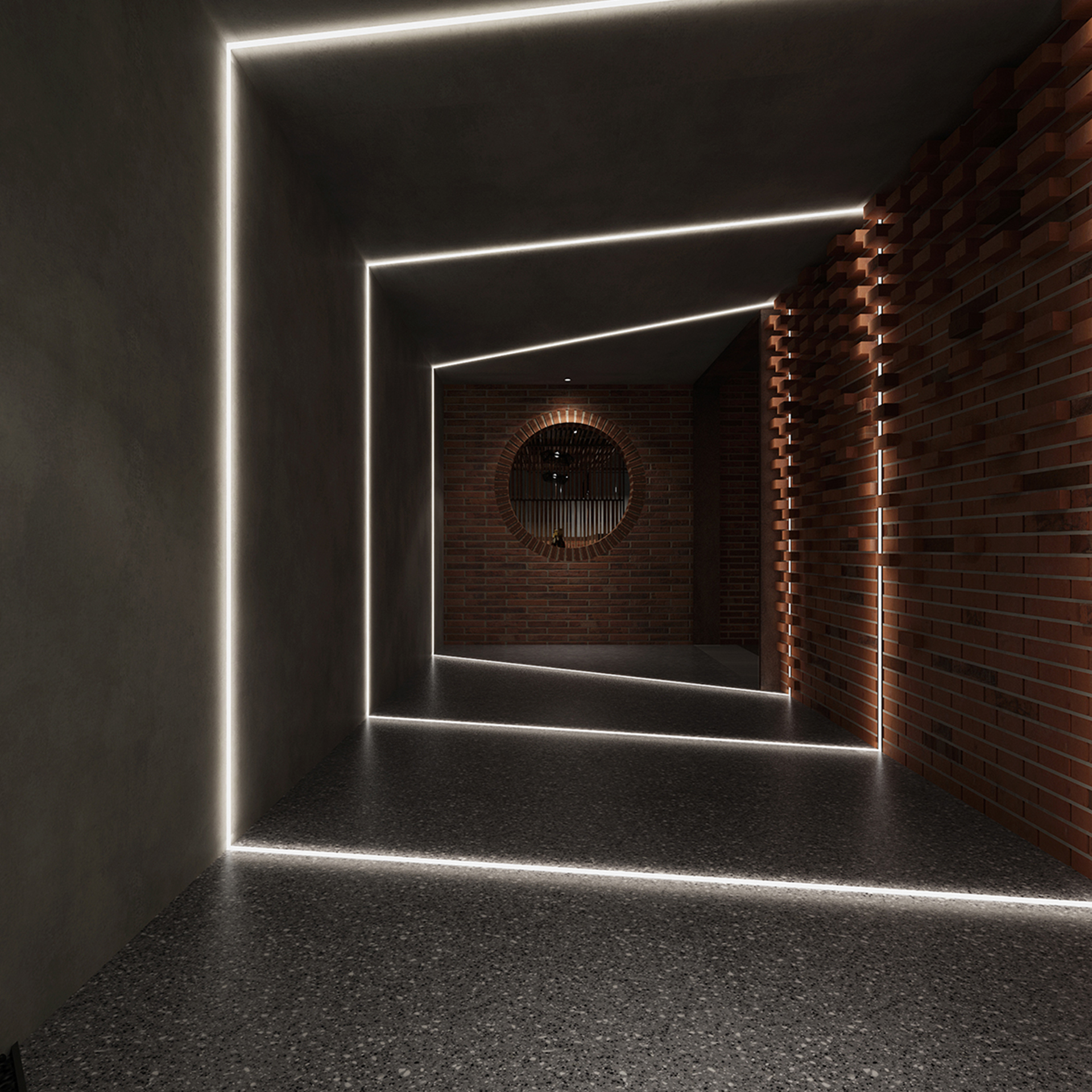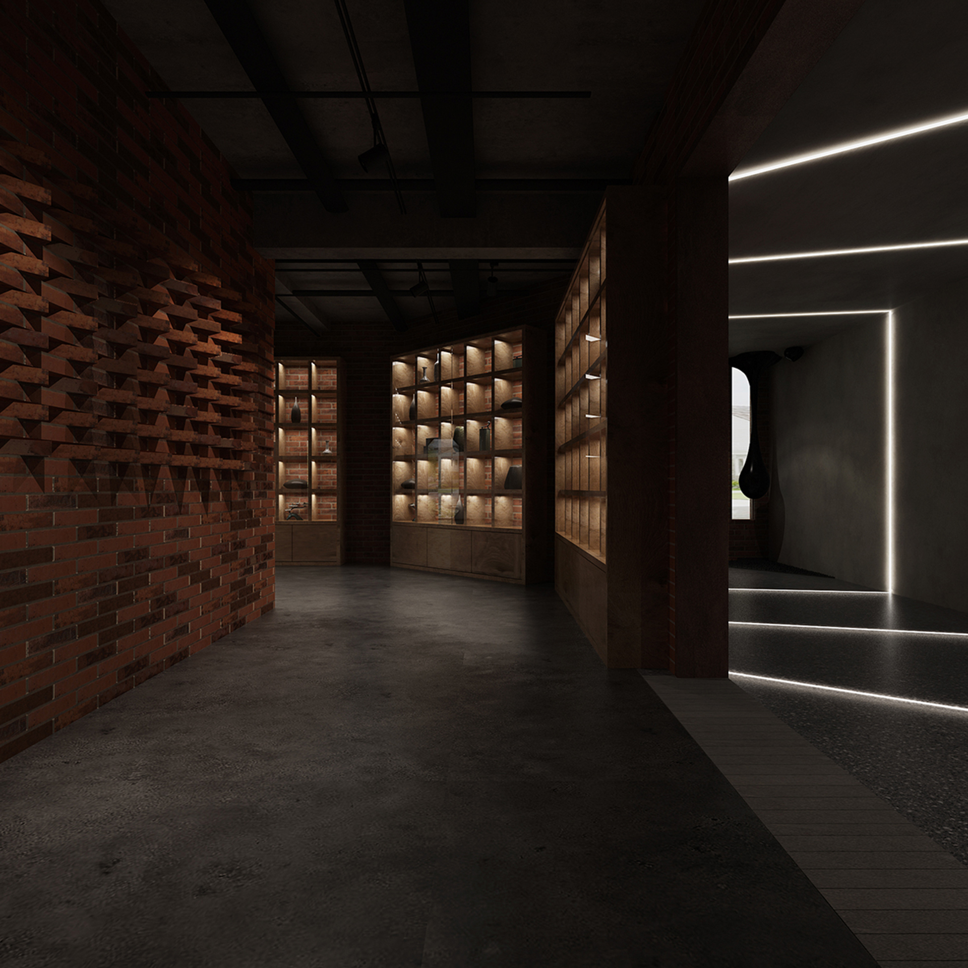 酒吧寬闊的通道讓吧臺、酒墻、沙發區分散開來,讓在不同區域活動的人在碩大的空間中找到自己的歸屬。光在整個空間中扮演著各種角色,有些讓人沉靜,有些讓人興奮。石墻、鵝卵石,最純粹的建筑元素在精心的排布和設計中發揮了其美的特點。墻面構筑元素采用了泡沫紅陶瓷用來模擬紅磚材料,防水防火。昏暗的環境下,人們才真正可以與世隔絕,享受自由。