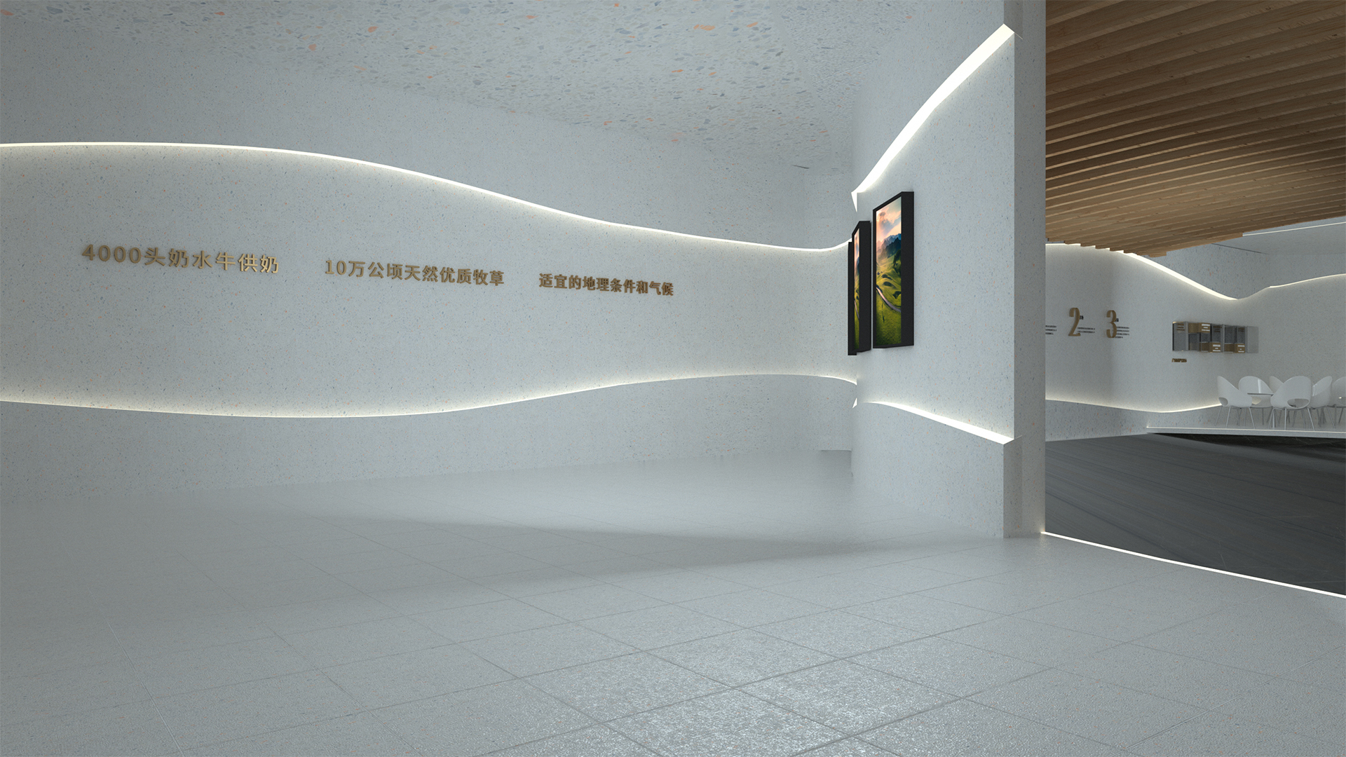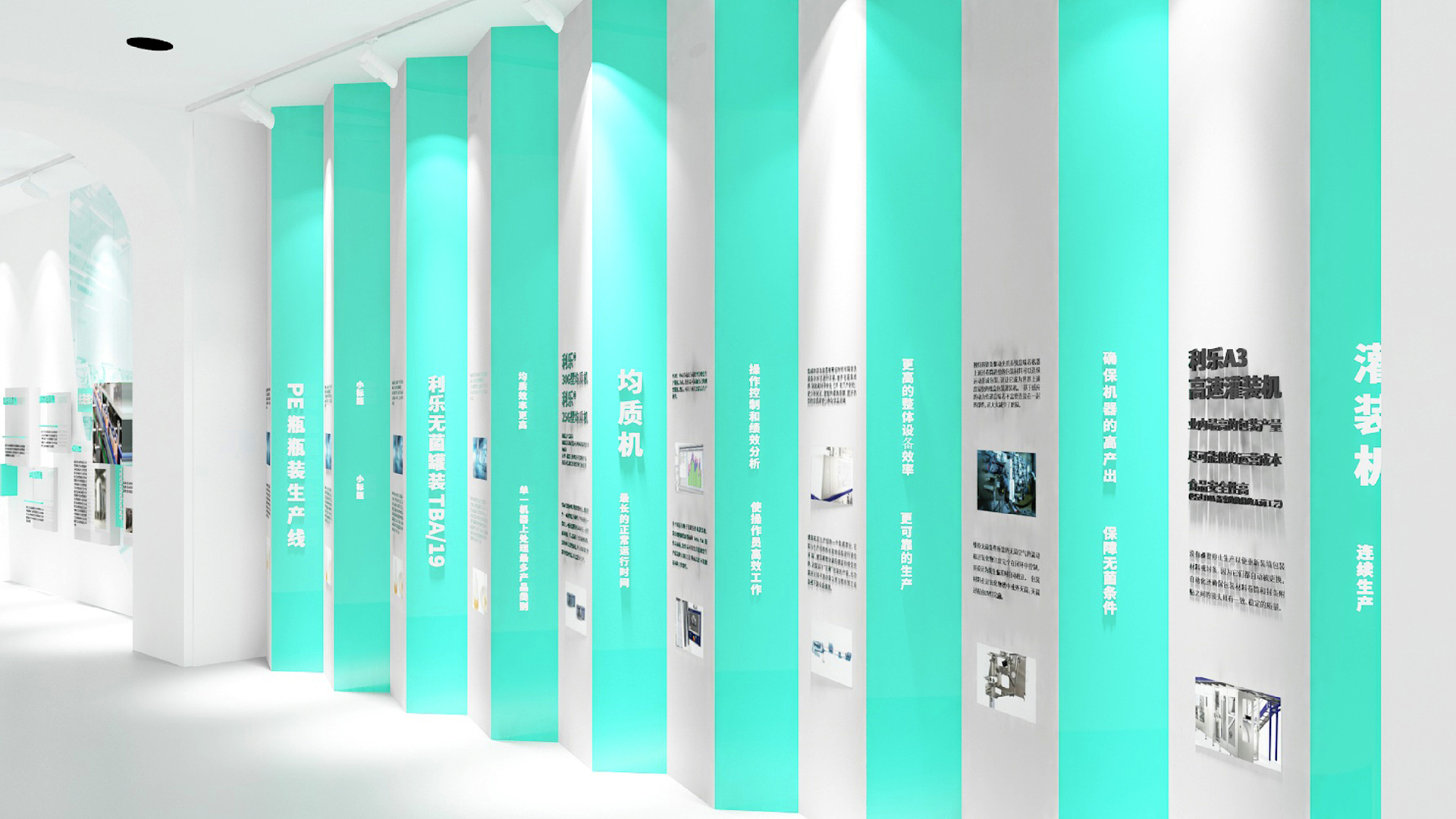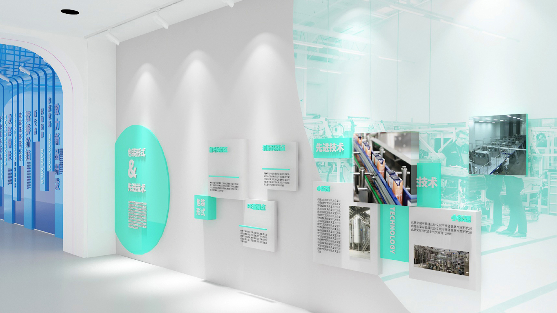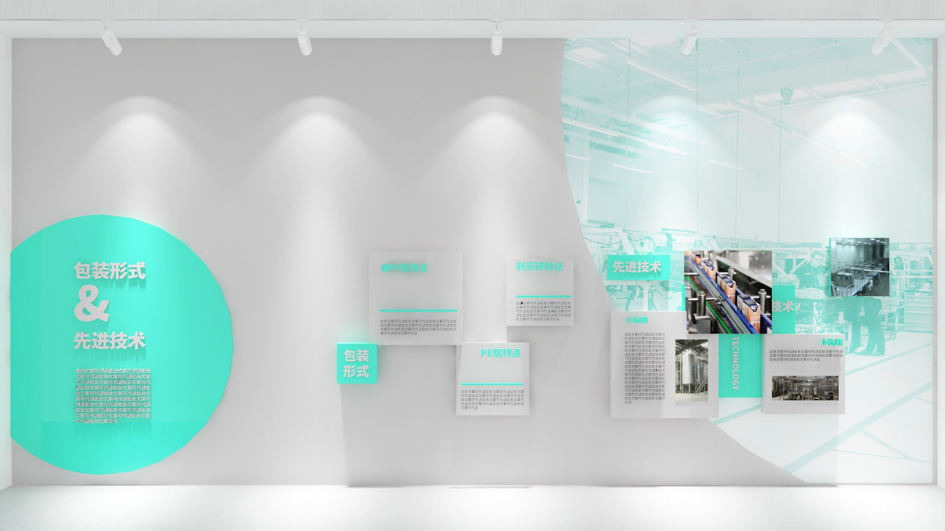 總控室后的玻璃,因為參觀走廊顏色比較豐富,考慮到如果這里也做色彩或者比較復雜的設計,會造成是視覺混亂,所以我們把這扇玻璃上的遮擋裝飾設計成和墻面一樣的白色,放上slogan,這樣整體比較統一自然。