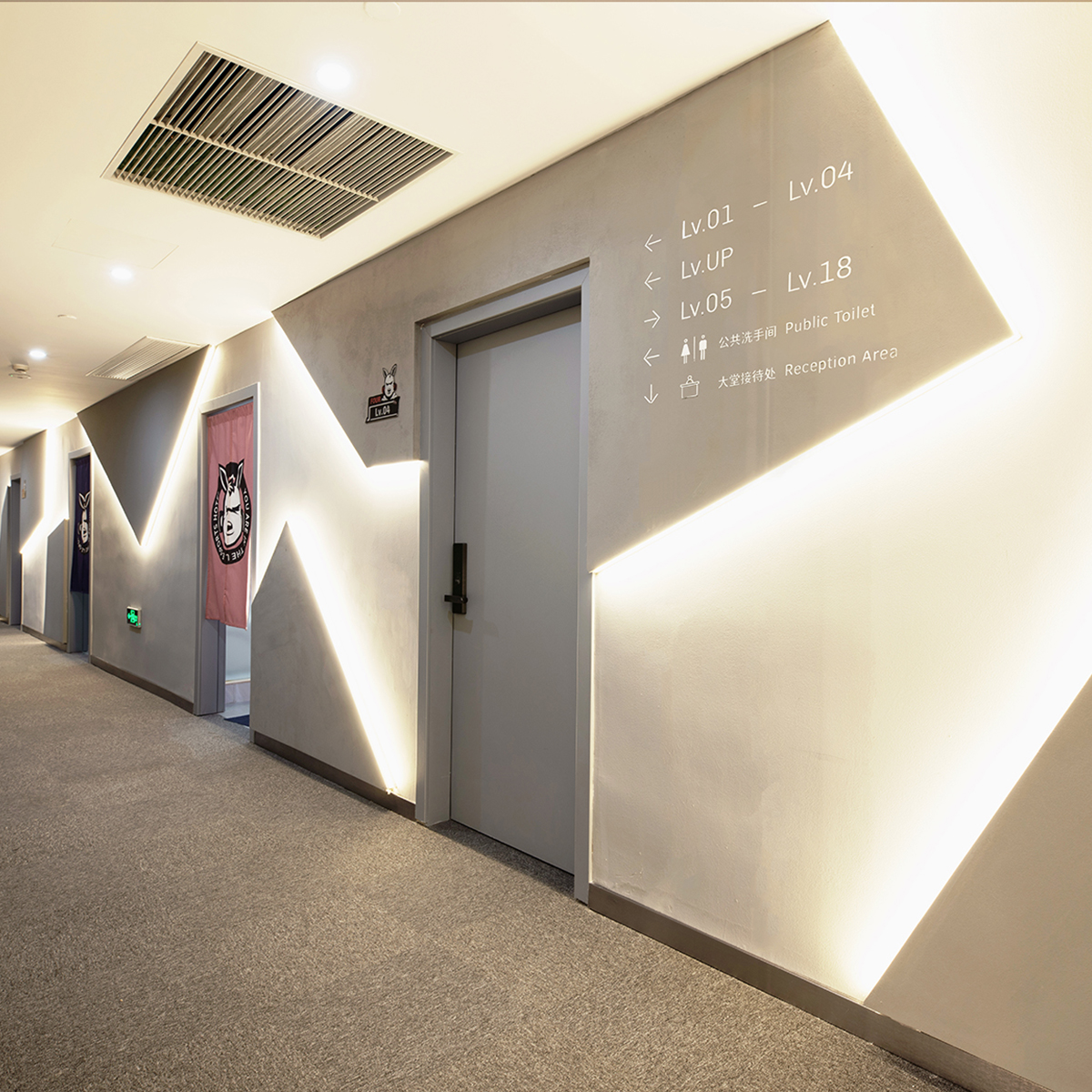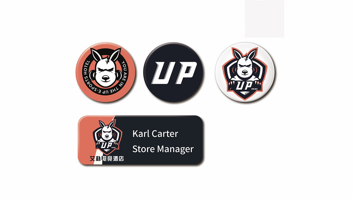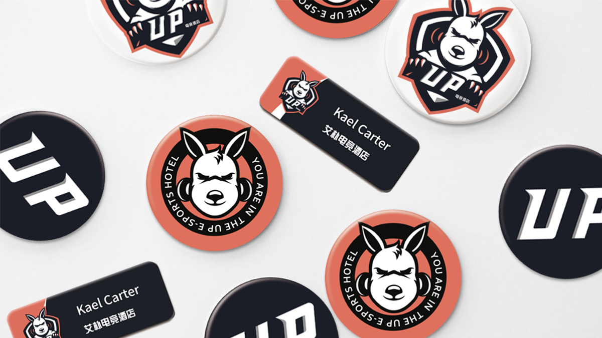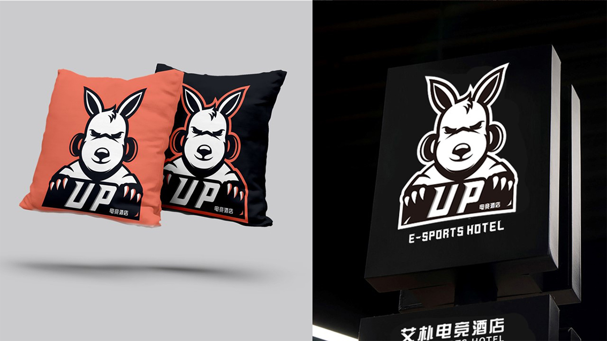 考慮到電競(jìng)酒店的屬性,在標(biāo)識(shí)設(shè)計(jì)上采用英文UP作圖文標(biāo)。袋鼠本身腿長(zhǎng)、有睡袋、只能向前奔跑,這些特點(diǎn)使得袋鼠寓意豐富。UP含有向上的、繁榮的意思,結(jié)合電競(jìng)團(tuán)隊(duì)合作、勇往直前、開(kāi)拓進(jìn)取、不認(rèn)輸?shù)?游戲精神,以及酒店服務(wù)效率高,服務(wù)范圍廣的經(jīng)營(yíng)理念,因此在眾多動(dòng)物中選用了袋鼠作為代表形象,增強(qiáng)標(biāo)識(shí)識(shí)別度的同時(shí),也寓意著企業(yè)未來(lái)蒸蒸日上。