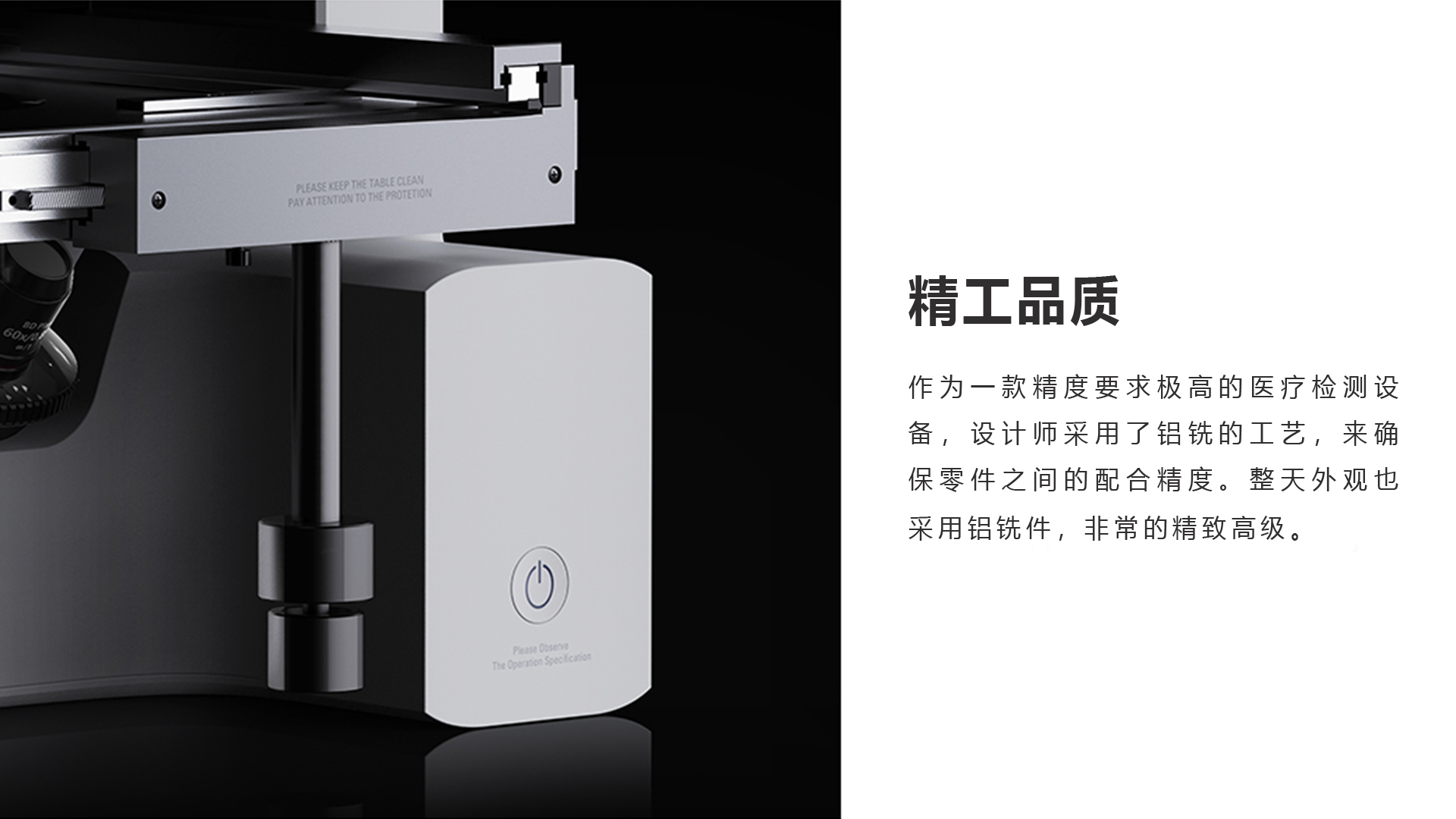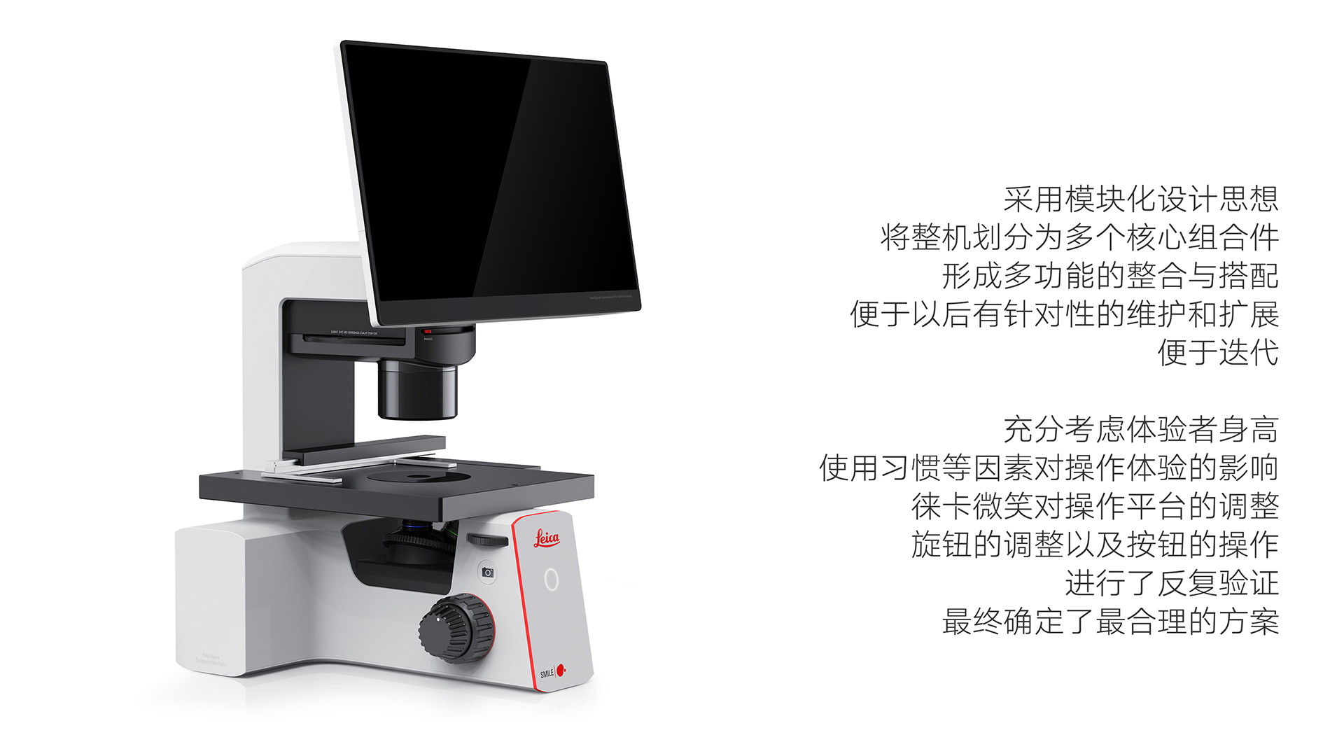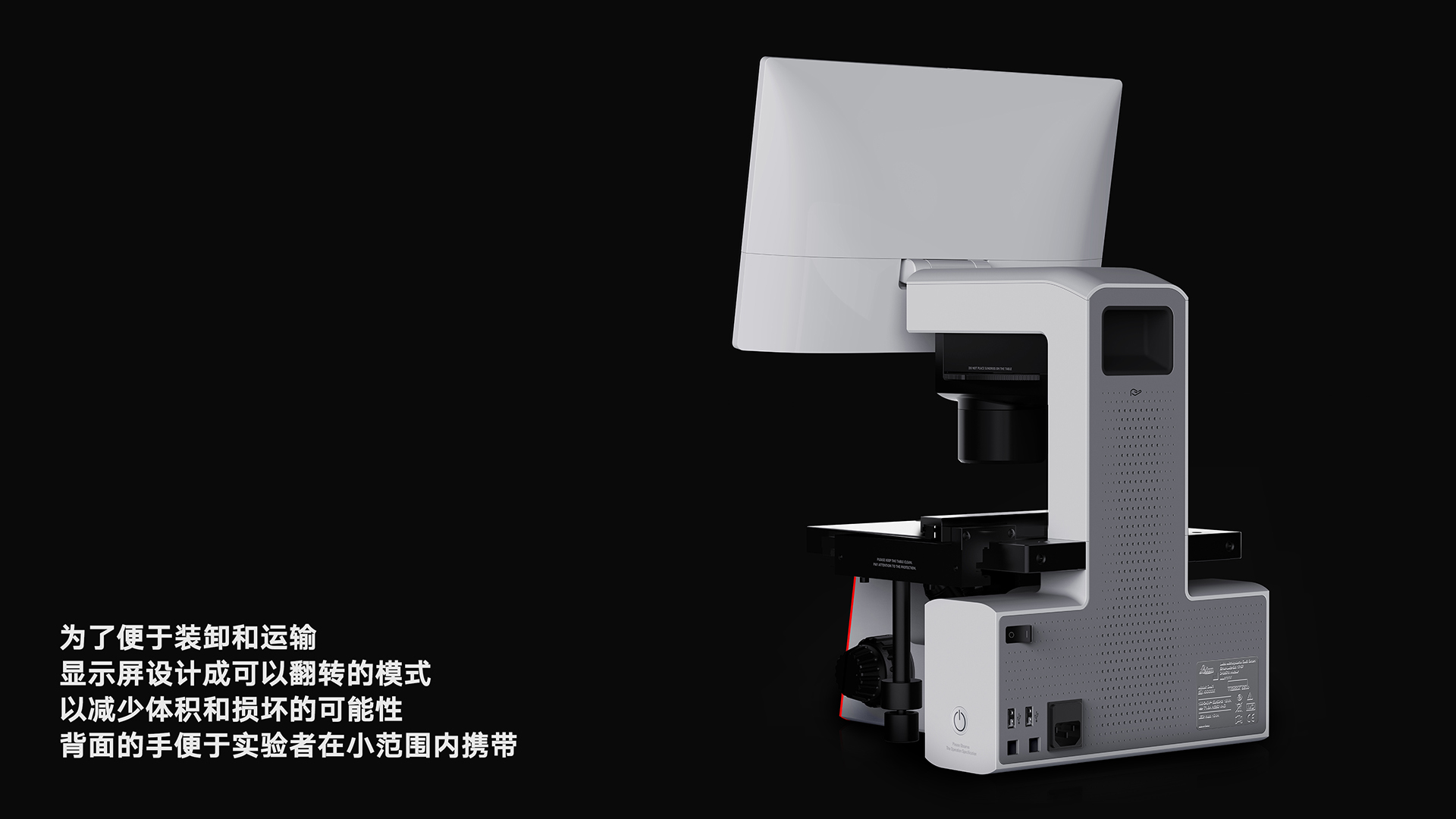 該顯微鏡采用模塊化設計思路,將整機分類成多個核心組合部件,形成多功能的整合與搭配。方便后期進行針對性維修和拓展,便于迭代。充分考慮實驗者身高,使用習慣等因素對操作體驗的影響,徠卡SMILE對操作臺的調節,旋鈕的調節,按鈕的操作等進行反復的驗證,最終確認最合理的方案。產品為方便搬運和運輸,將顯示屏設計成可翻折的模式,減小體積,減小損傷的可能性。背后的摳手方便實驗人員在小范圍內搬運。